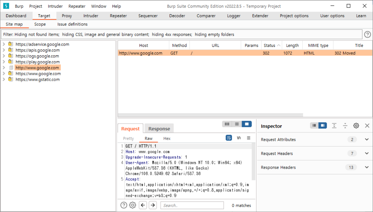 HTTP history : Burp Proxy를 통과한 모든 요청 및 응답에 대한 전체 기록이 저장