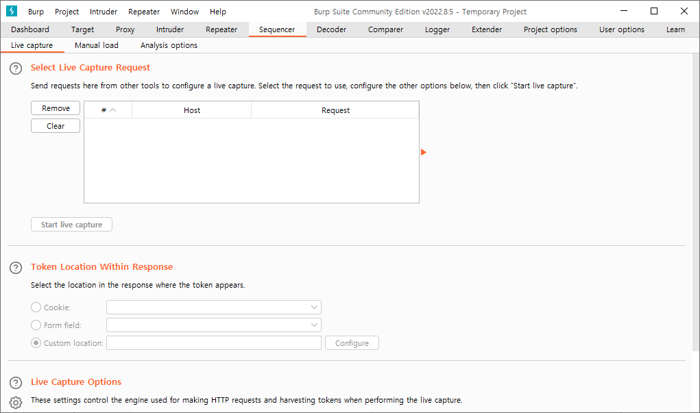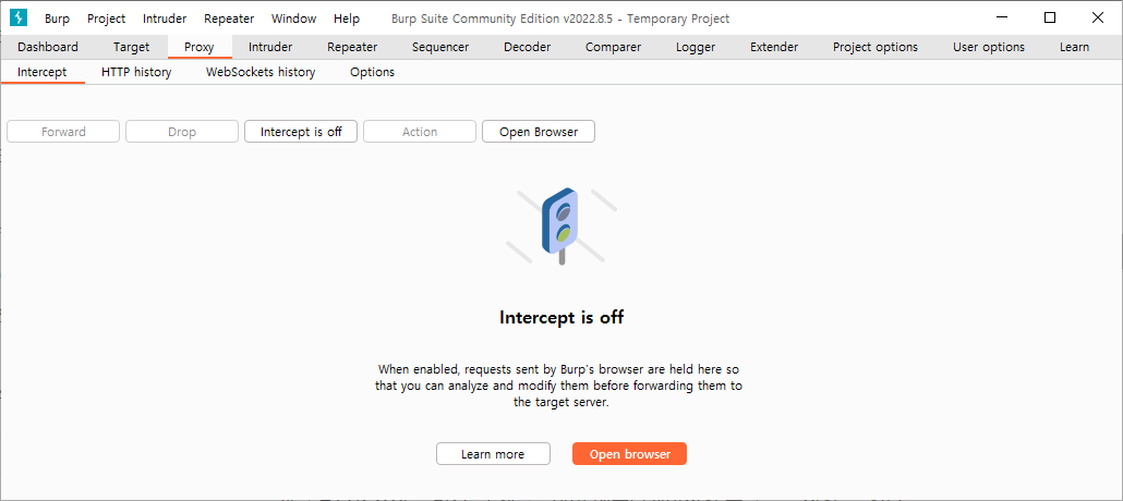 Open Browser - 별도의 프록시 설정 없이 Intercept 가능한 브라우저 창 켜짐