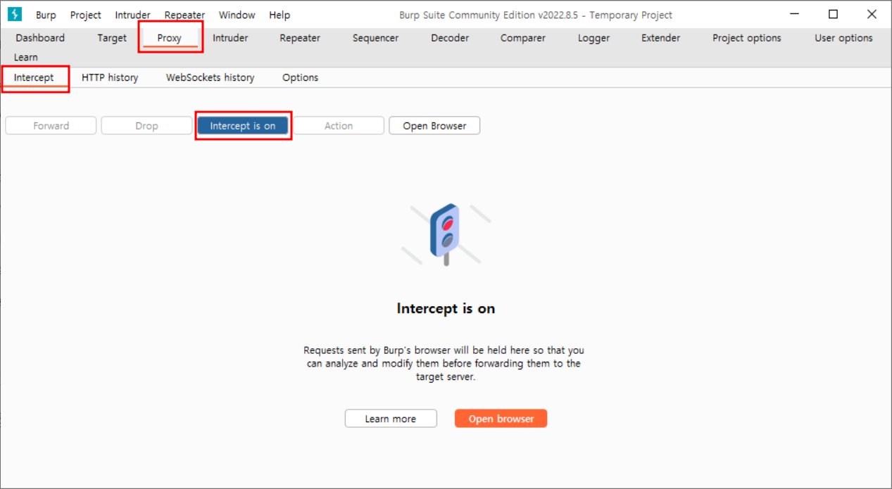 잘 돌아가는지 확인하기 위하여 Proxy - Intercept - Intercept is on을 클릭한다.