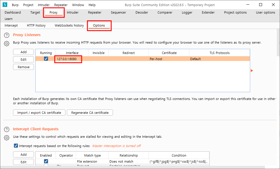 Options : Proxy listeners, HTTP 요청 및 응답 인터셉트, WebSocket 메세지 인터셉트, 응답 수정, 일치 및 교체, TLS 통과, 기타 옵션을 설정